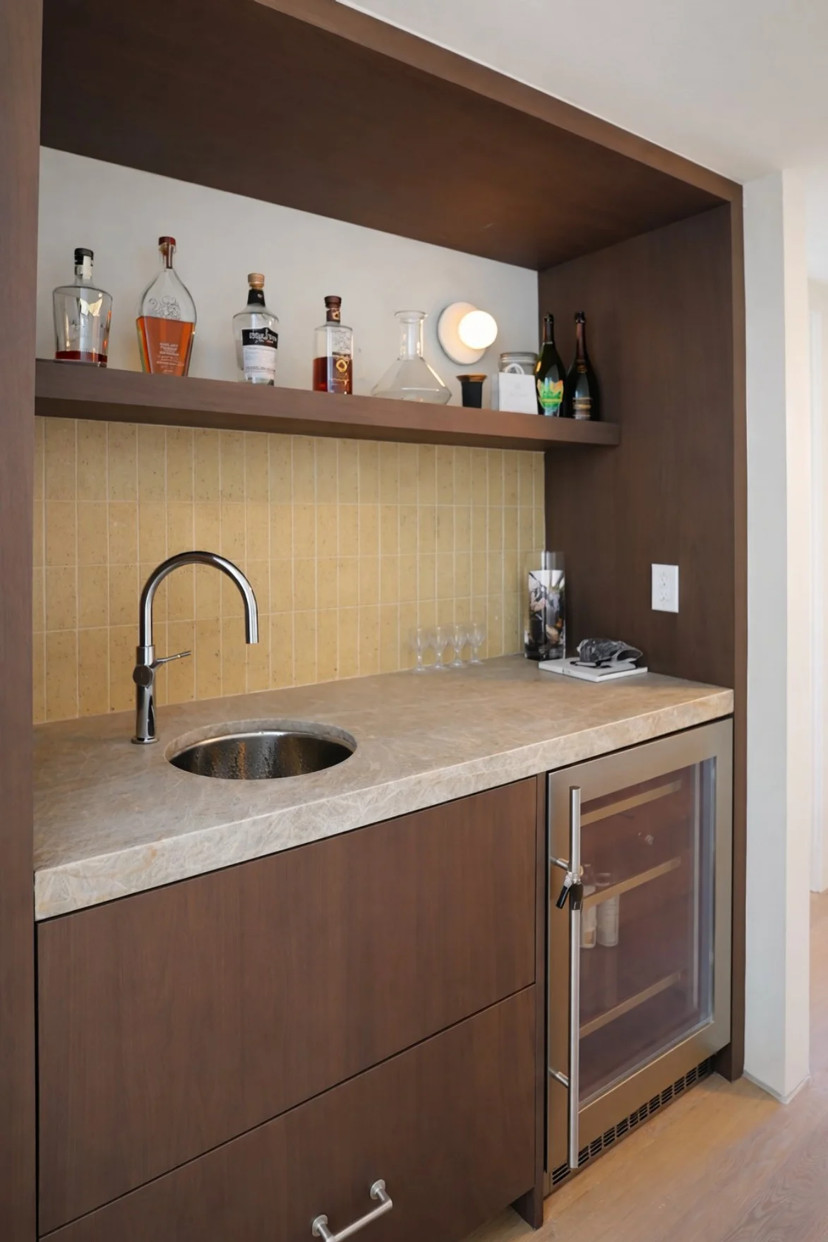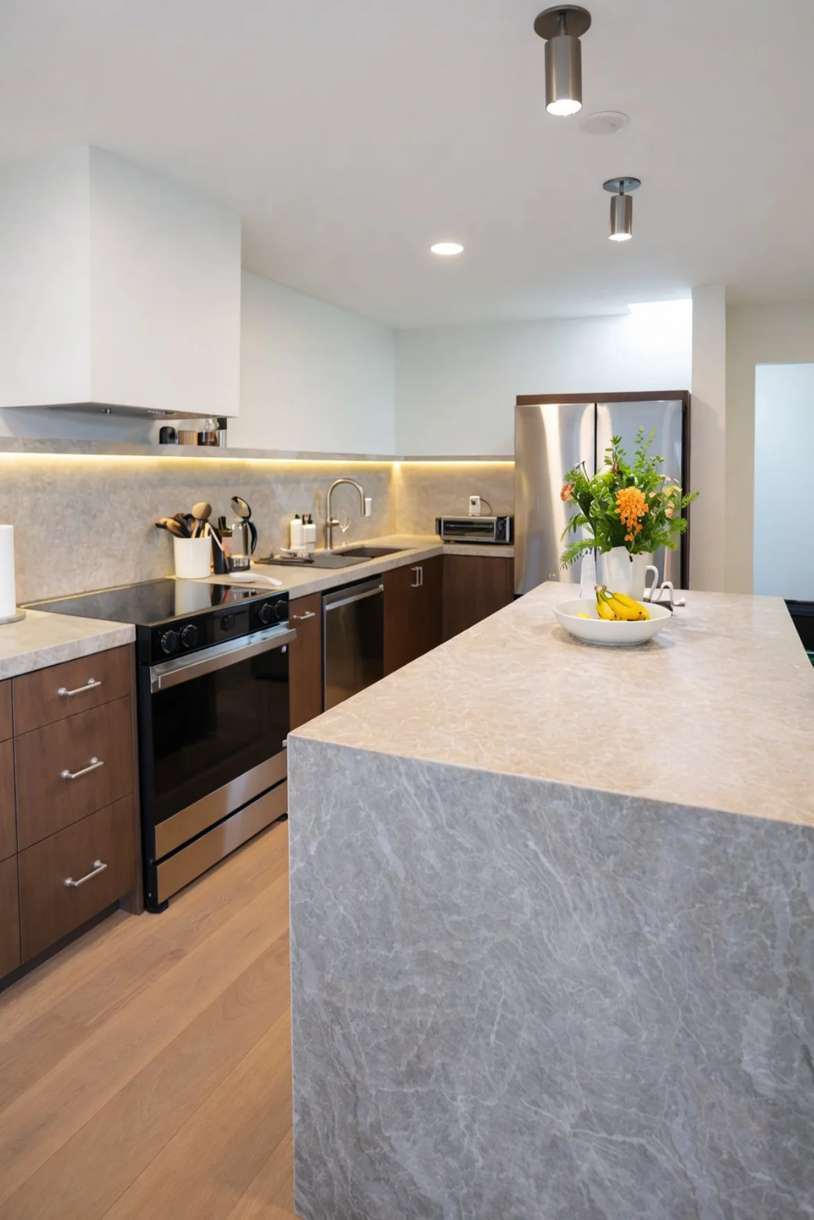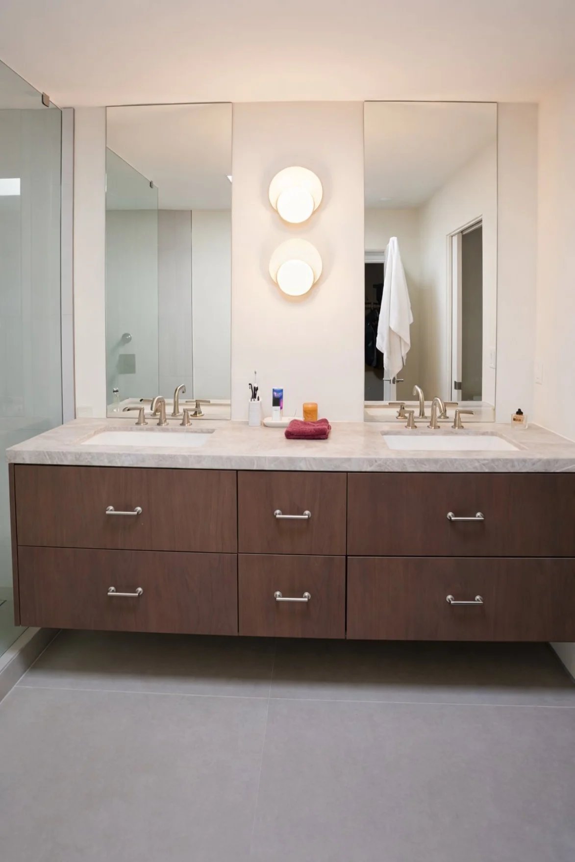 Located in the heart of Biltmore, this home was thoughtfully reimagined with a clean, modern aesthetic and a focus on light, flow, and functionality. The floor plan was opened to create a seamless living experience, complemented by expanded windows that bring in abundant natural light. White oak flooring adds warmth throughout, while drywall returns and flush, flat-panel doors deliver a sleek architectural finish. Custom wood cabinetry is paired with Taj Mahal quartzite countertops, tying together the kitchen and living spaces with a refined, timeless look. Every element—from the finishes to the fixtures—was intentionally selected to create a cohesive design that feels both elevated and livable.